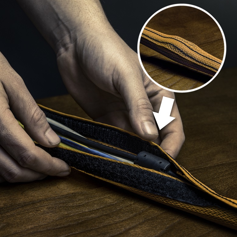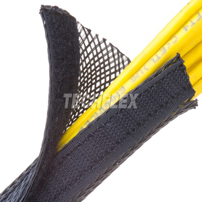 FLEXO WRAP is an exclusive product engineered and manufactured by Techflex. FLEXO WRAP provides the perfect solution to a wide range of applications. The hook and loop closure provides for easy on and off installation. Additionally, it allows instant and convenient access for harness break-outs and rework of any specific section along the entire length of the sleeve. The open weave design will conform to a variety of bundle diameters and will wrap around irregular shapes as a cable cover